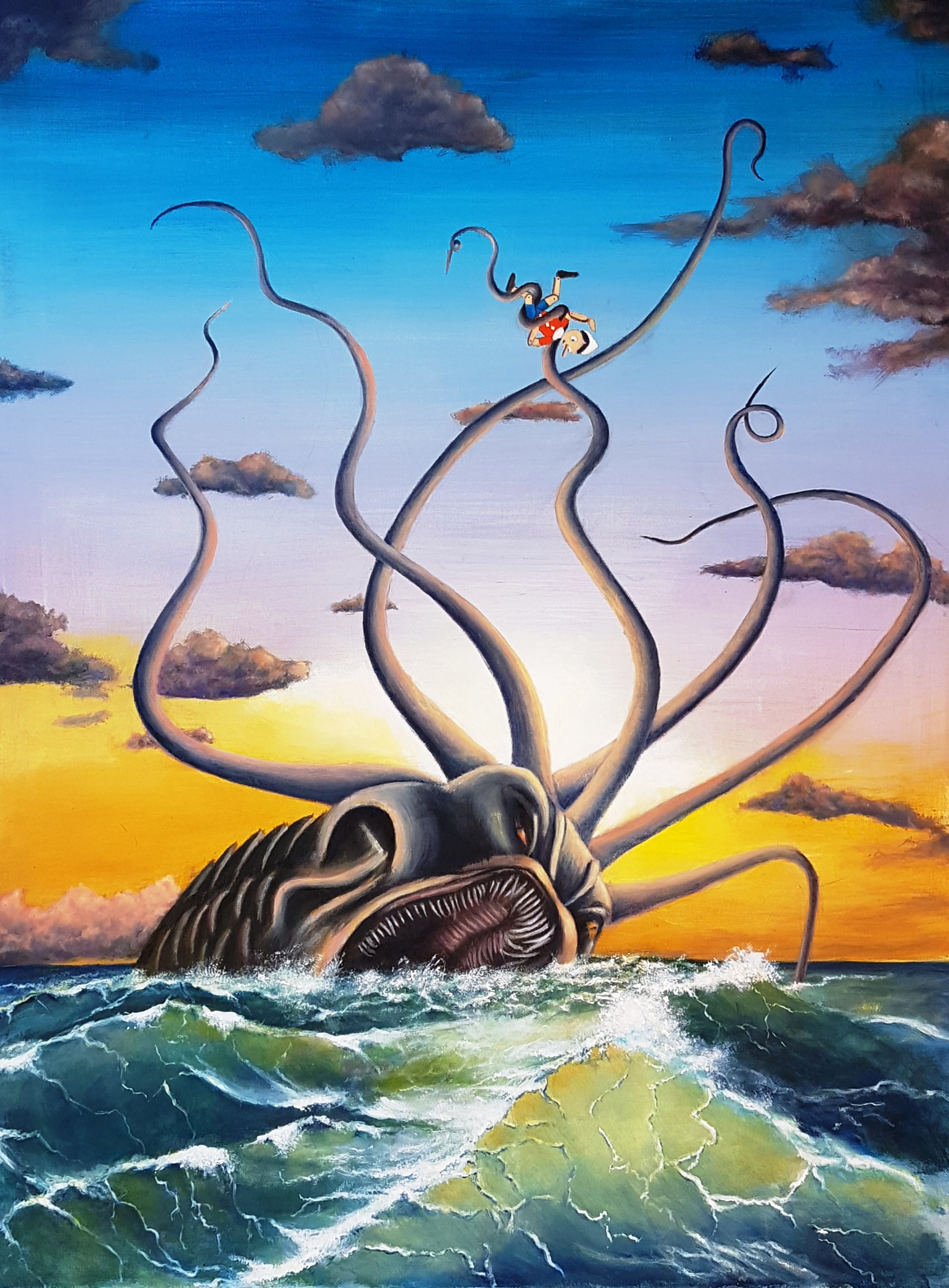 Eros contro Thenatos 90×50 anno 2023 tecnica acrilico